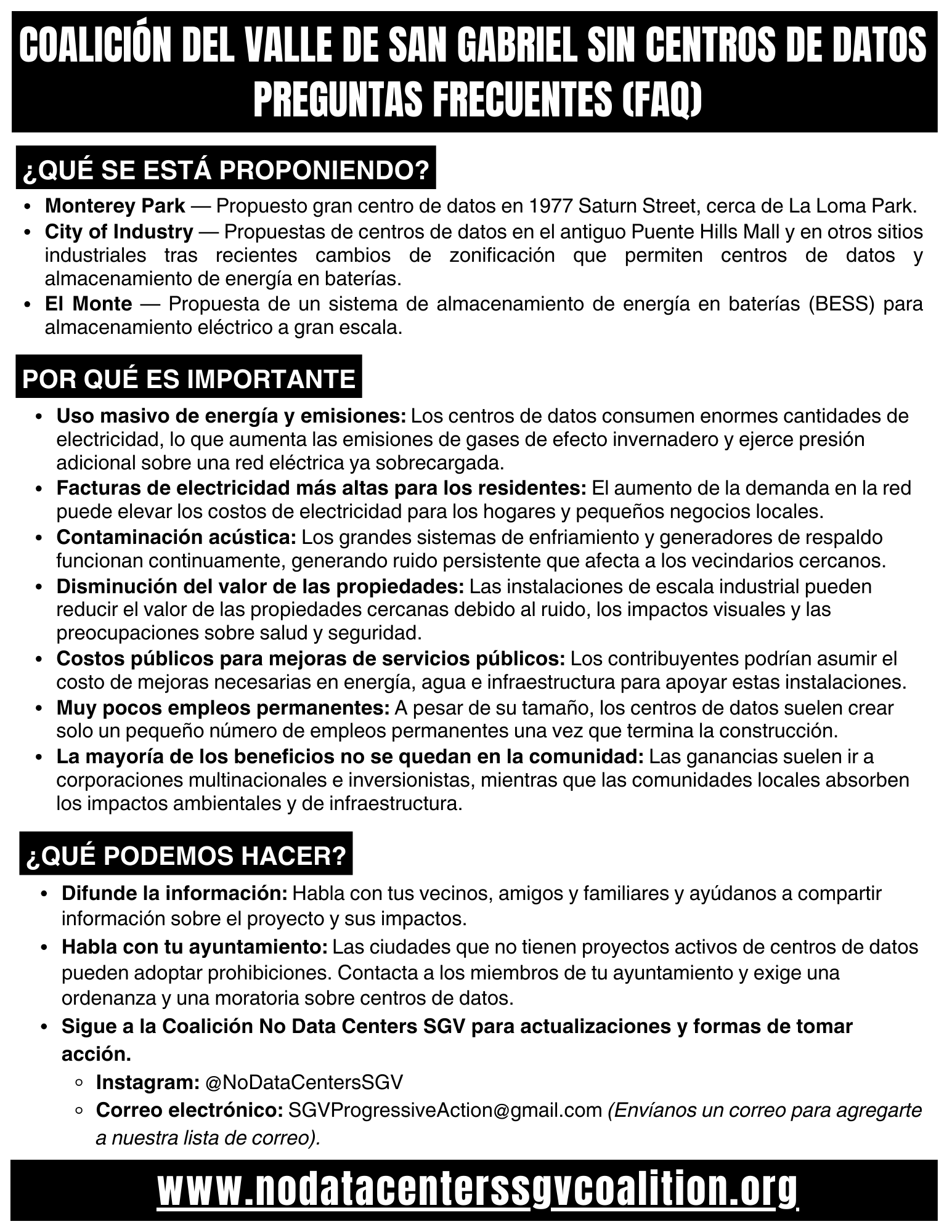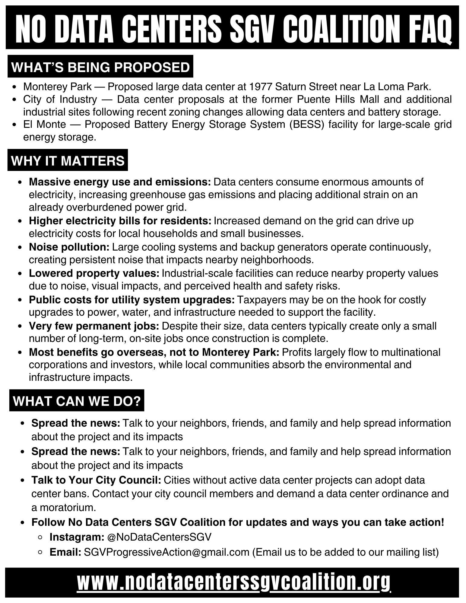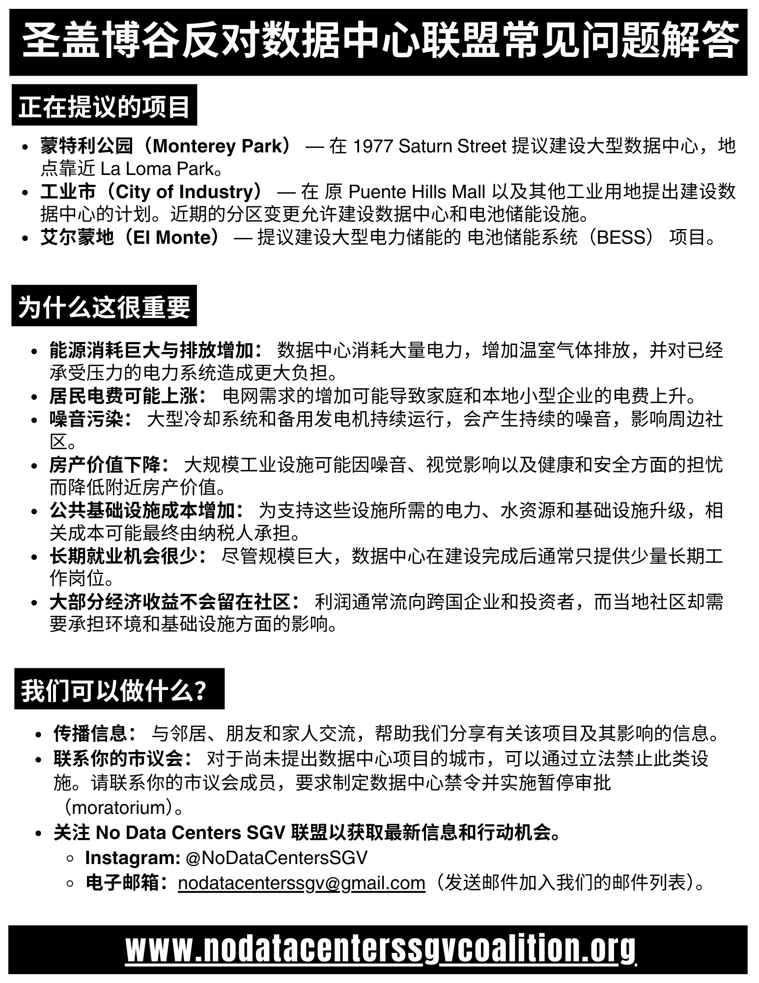 Resources Tri-lingual No Data Centers in City of Industry Flyer No Data Centers SGV Coalition General FAQ Flyers (English, Spanish, and Chinese; single paged)